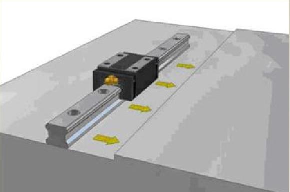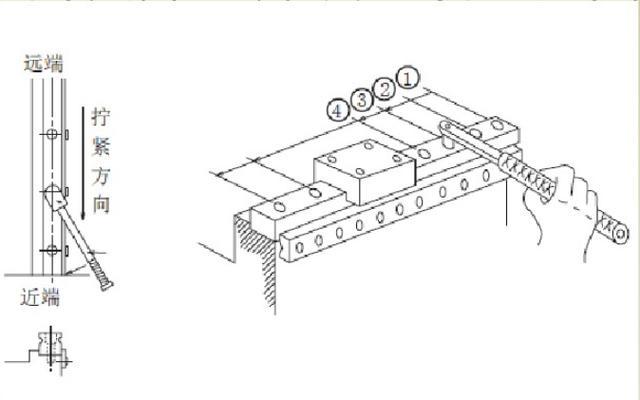 (2)由遠(yuǎn)端向近端依次鎖緊螺釘,螺釘鎖緊扭矩參照上例中的扭矩表數(shù)值。所有的螺栓擰緊后用千分表從導(dǎo)軌一段滑到另一端確保平行度。當(dāng)無側(cè)向定位裝配面時(shí),如果螺釘從導(dǎo)軌中部開始安裝,由于安裝螺栓和安裝孔之間存在的摩擦,很容易造成導(dǎo)軌的微小S變形,建議由遠(yuǎn)端向近端依次鎖緊螺釘。