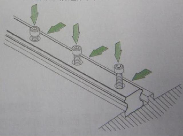 (3)由遠(yuǎn)端向近端按順序?qū)⒒壍亩ㄎ宦萁z稍微旋緊,使軌道與垂直安裝面稍微貼合。垂直基準(zhǔn)面稍微旋緊后,加強(qiáng)側(cè)向基準(zhǔn)面的鎖緊力,使主軌可以確實(shí)貼合側(cè)向基準(zhǔn)面。
