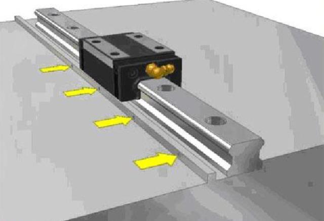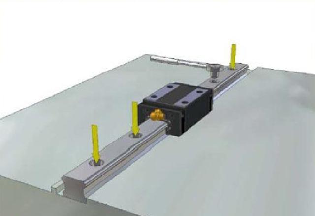 (2)將主軌輕輕安置在床臺(tái)上,使用側(cè)向固定螺絲或其他固定治具使線軌與側(cè)向安裝面輕輕貼合。安裝使用前要確認(rèn)螺絲孔是否吻合,假設(shè)底座加工孔不吻合又強(qiáng)行鎖緊螺栓,會(huì)大大影響到組合精度與使用品質(zhì)。