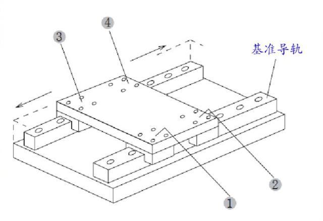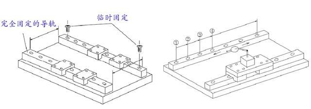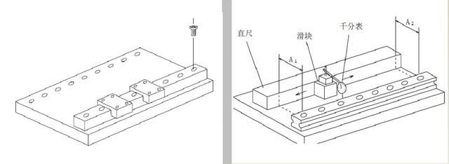 (3)剛才被完全固定的導(dǎo)軌此時(shí)可以當(dāng)做基準(zhǔn)軌使用了,在從動(dòng)導(dǎo)軌的兩端各暫時(shí)擰上一個(gè)螺釘。然后在基準(zhǔn)軌的兩個(gè)滑塊上放置千分表,移動(dòng)千分表邊讀數(shù)邊把調(diào)整軌的螺栓從一端向另一端依次鎖緊。