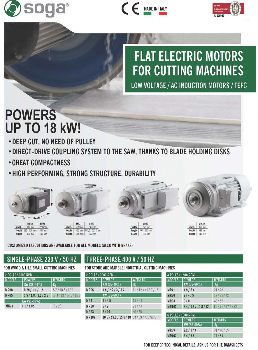 意大利Soga石材切割機(jī)MR系列,一款臥式,三相/單相低壓交流感應(yīng)切割電機(jī),轉(zhuǎn)速有3000轉(zhuǎn),1500轉(zhuǎn),1000轉(zhuǎn)。MR58/MR65/MR71/MR80/MR93系列防護(hù)等級(jí)IP55,MR107系列防護(hù)等級(jí)IP65。切割電機(jī)功率高達(dá)18KW,切割能力強(qiáng),不需要滑輪帶動(dòng),直接驅(qū)動(dòng)耦合系統(tǒng)的鋸,因刀片的持有磁盤。密實(shí)度強(qiáng),性能良好,結(jié)構(gòu)堅(jiān)固耐用。MR58/MR65/MR71用于木材和瓷磚的小型切割設(shè)備,MR80/MR93/MR107用于石材和大理石工業(yè)的切割機(jī)。